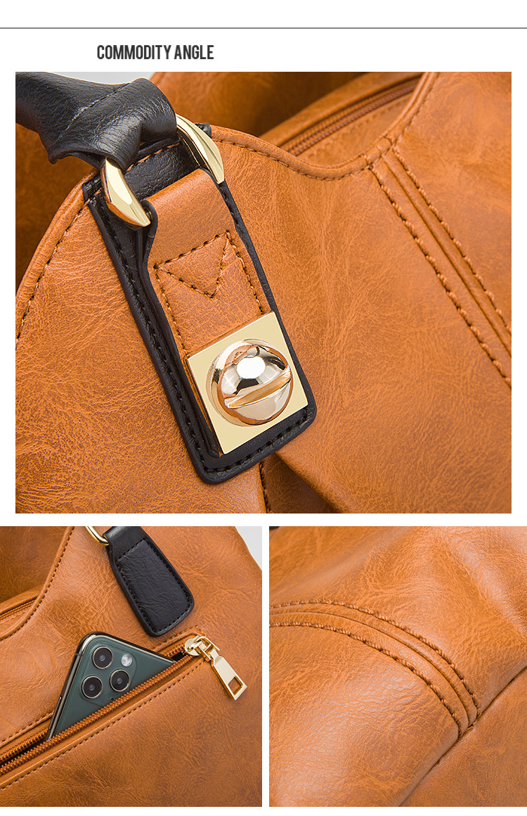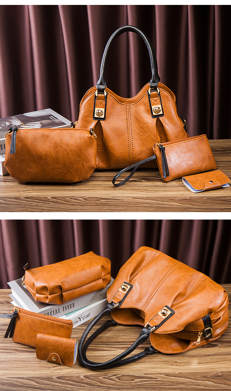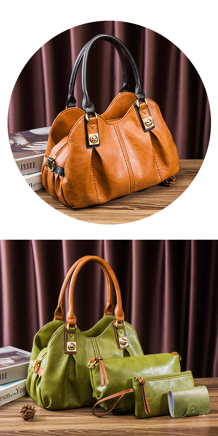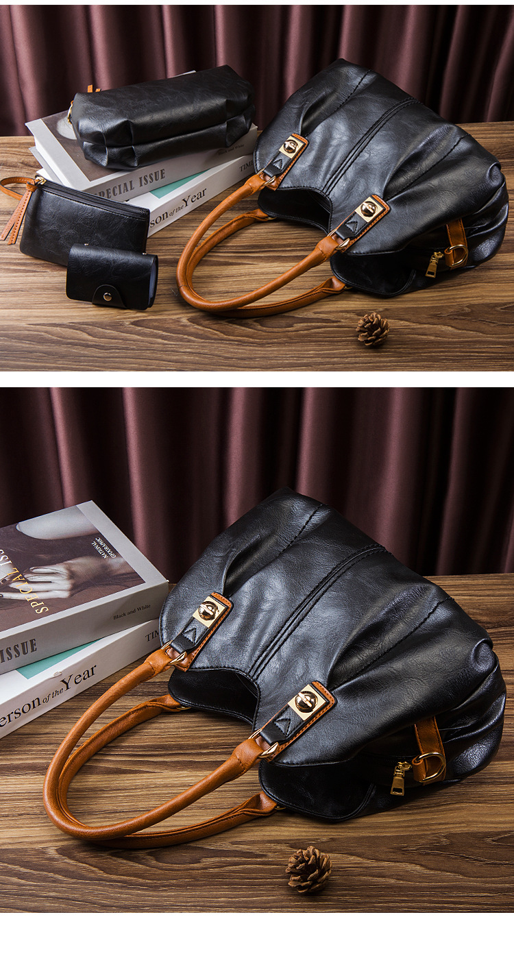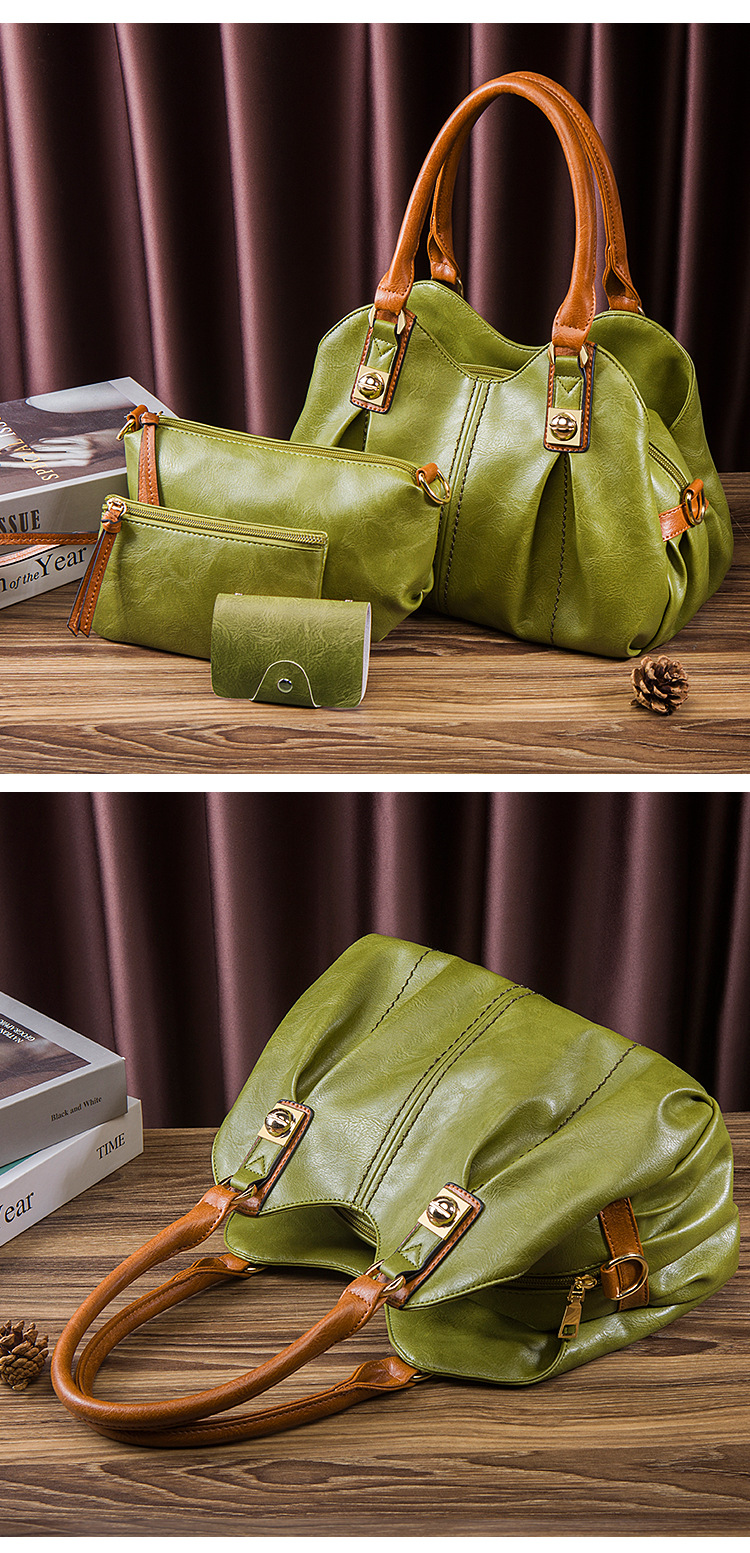 Bộ Túi Xách Nữ Da Bóng Vintage 3 Món Phong Cách Âu Mỹ là sản phẩm thuộc danh mục Túi xách Nữ, bộ túi xách Nữ phong cách vintage. Bộ sản phẩm bao gồm một túi xách tay nữ cỡ lớn, một túi đeo vai và một ví nhỏ, tất cả đều được làm từ chất liệu da bóng cao cấp. Thiết kế mang đậm phong cách Âu Mỹ với đường nét tinh tế và màu sắc trang nhã. Túi xách tay nữ có quai xách chắc chắn và không gian chứa đồ rộng rãi. Sản phẩm có các màu đen, nâu và xanh rêu. Bộ túi xách tay Nữ là phụ kiện thời trang không thể thiếu của phái đẹp. | Tên sản phẩm: Bộ Túi Xách Nữ Da Bóng Vintage 3 Món Phong Cách Âu Mỹ Màu Đen, Nâu, Xanh Rêu. | Mã sản phẩm: A0672 - Giá: 610000đ. | Mã nhà sản xuất: SHRYIN - G02 | Danh mục sản phẩm: Bộ túi xách Nữ - Túi xách tay Nữ.Hình ảnh sản phẩm