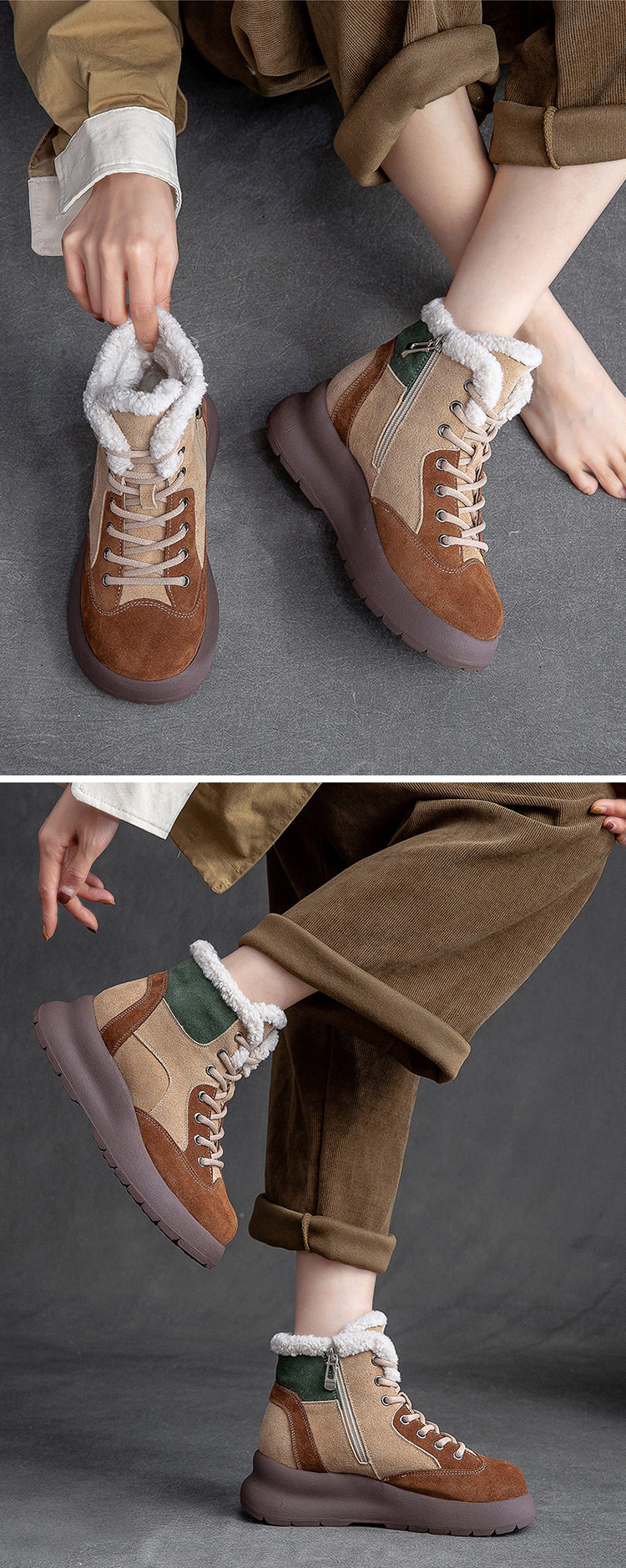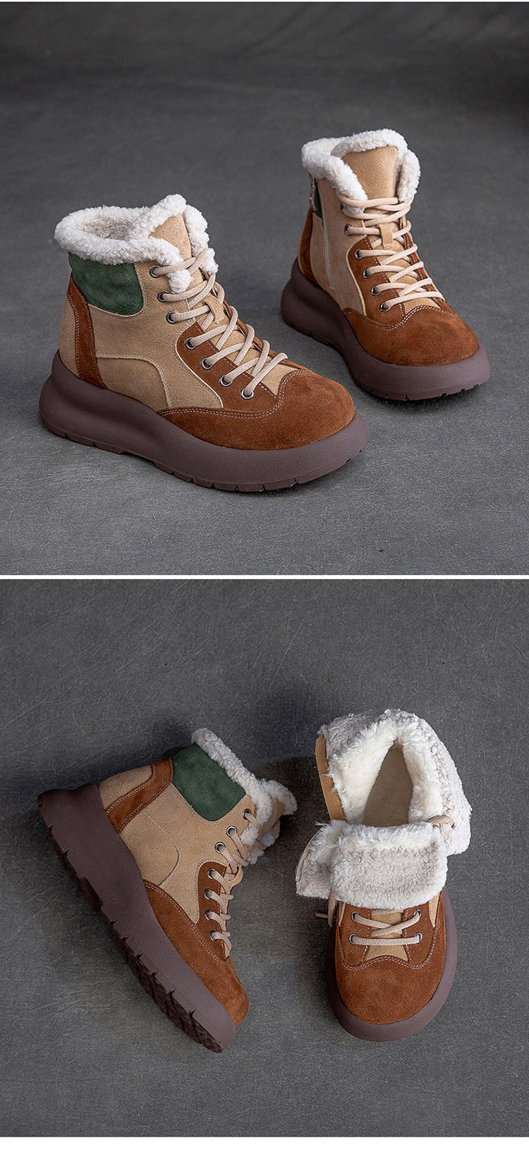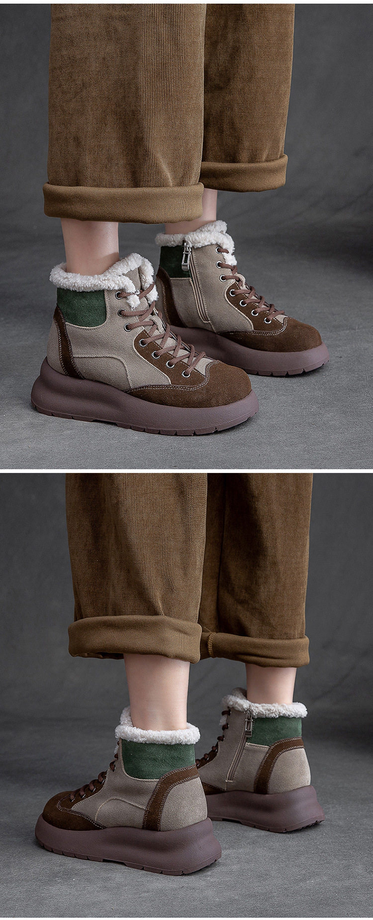 Boot Nữ Cổ Lông Đế Dày là sản phẩm thuộc danh mục Giày dép Nữ, kiểu dáng Boot Nữ thời trang. Thiết kế Boot Cổ Cao Nữ này có phần cổ được lót lông ấm áp, đế dày dặn giúp tăng chiều cao khoảng 5cm. Giày có phối màu độc đáo giữa Nâu, Be và Xanh Lá tạo nên vẻ ngoài cá tính. Chất liệu bề mặt có thể là nỉ hoặc da mờ. Mẫu boot này không chỉ giữ ấm tốt mà còn là điểm nhấn cho phong cách thời trang của bạn. Sản phẩm phù hợp cho mùa đông, giúp bạn tự tin thể hiện cá tính riêng. | Tên sản phẩm: Boot Nữ Cổ Lông Đế Dày Phối Màu Chiều Cao Đế Khoảng 5cm Màu Nâu, Be, Xanh Lá. | Mã sản phẩm: B3108 - Giá: 2480000đ. | Mã nhà sản xuất: SHNTEZ - G05 | Danh mục sản phẩm: Boot Nữ - Boot Cổ Cao Nữ.Hình ảnh sản phẩm