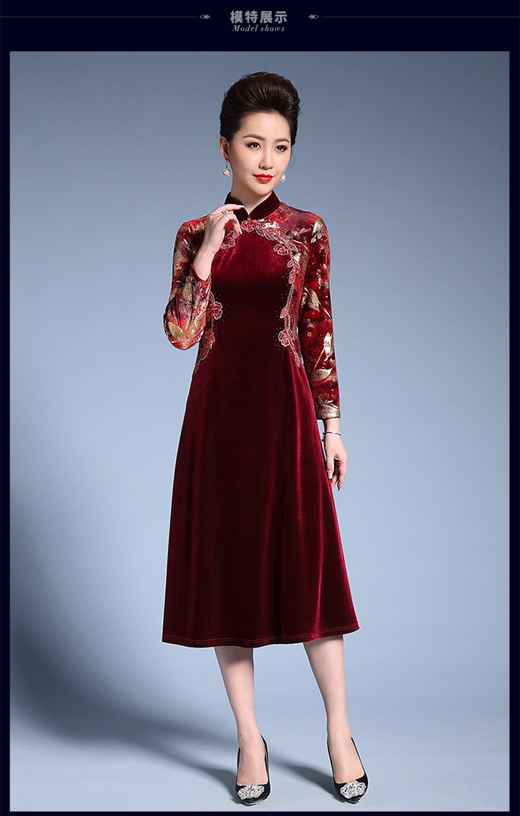 Váy nhung thêu hoa tay dài dáng chữ A là mẫu váy đầm nữ dự tiệc sang trọng, quý phái. Thiết kế cổ tàu, tay dài thanh lịch, váy dáng chữ A giúp tôn dáng và che khuyết điểm. Chất liệu nhung mềm mại, cao cấp kết hợp cùng họa tiết thêu hoa tinh xảo, tỉ mỉ. Mẫu váy dự tiệc nữ này phù hợp cho các quý cô trung niên diện trong các buổi tiệc, sự kiện quan trọng. Váy có màu đỏ đô sang trọng, quyến rũ, mang đến vẻ đẹp quý phái và thanh lịch cho người mặc. | Tên sản phẩm: Váy Nhung Thêu Hoa Tay Dài dáng chữ A, Cổ Tàu, Trang Phục Trung Niên Dự Tiệc, Màu Đỏ Đô. | Mã sản phẩm: D1733 - Giá: 3470000đ. | Mã nhà sản xuất: SHDG - G06 | Danh mục sản phẩm: Váy đầm Nữ - Váy dự tiệc Nữ.Hình ảnh sản phẩm