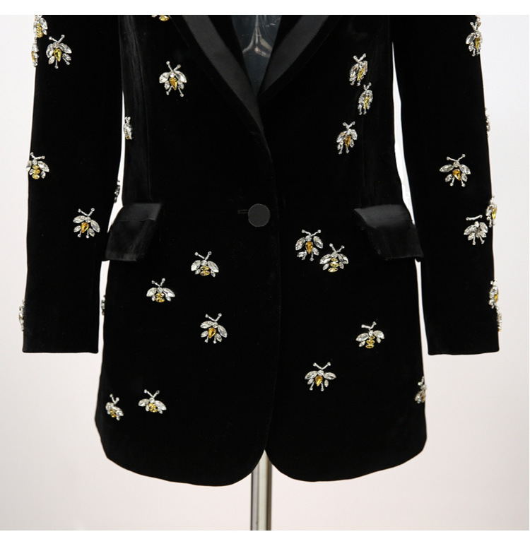Áo khoác blazer nữ dáng dài chất liệu nhung là sản phẩm thời trang nữ cao cấp. Áo khoác nữ này có thiết kế dáng dài thanh lịch, phù hợp với nhiều phong cách khác nhau. Chất liệu nhung mềm mại, ấm áp, tạo cảm giác thoải mái khi mặc. Điểm nhấn của áo blazer nữ là họa tiết ong đính tinh xảo, mang đến vẻ đẹp độc đáo và thu hút. Áo blazer nữ màu đen dễ dàng phối đồ, phù hợp với nhiều dịp khác nhau, từ đi làm đến đi chơi. Đây là mẫu áo khoác blazer nữ không thể thiếu trong tủ đồ của phái đẹp. | Tên sản phẩm: Áo Khoác Blazer Nữ Dáng Dài Chất Liệu Nhung Đính Họa Tiết Ong Màu Đen. | Mã sản phẩm: T1584 - Giá: 2910000đ. | Mã nhà sản xuất: SHDPA - G06 | Danh mục sản phẩm: Áo khoác Nữ - Áo blazer Nữ.Hình ảnh sản phẩm