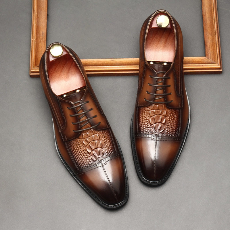 Giày Tây Buộc Dây Nam Vân Cá Sấu Da Bóng Chiều Cao Đế Khoảng 3cm Màu Nâu, Đen