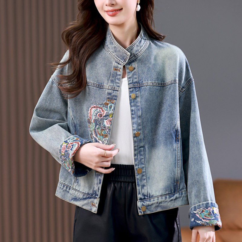 Áo Khoác Jean Nữ Thêu Họa Tiết Phong Cách Trung Hoa Dáng Ngắn Màu Xanh Jean