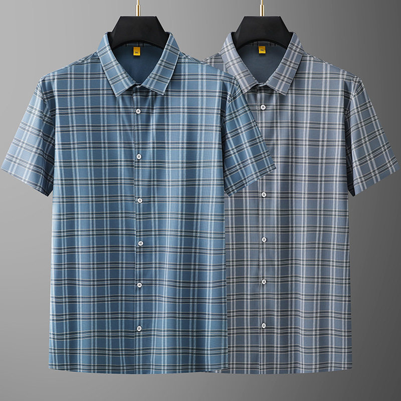 Áo Sơ Mi Nam Tay Ngắn Form Rộng Cổ chữ Vuông Họa Tiết Kẻ Caro Màu Xanh Lam, Xám